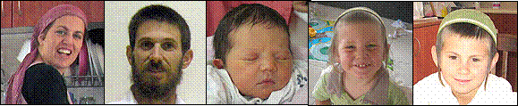 3-month old Hadas, 4-year old Eldad, and 11-year old Yoav. THE STORY: Late last Friday evening, following the beginning of the Jewish Sabbath, terrorists broke into a small house in the town of Itamar, after the family had gone to bed, and stabbed five members of the family to death in cold blood, including a three month old baby girl. They entered through a living room window. They apparently overlooked the 6-year-old boy sleeping on the sofa in the living room, because they went directly to a bedroom where they found the father asleep with his newborn baby girl. They slashed the father's throat and stabbed the infant to death. Then the mother came out of the bathroom, and she was murdered in the doorway where she stood. They then moved on to another bedroom, where they slashed the throat of the 11-year old-son who was reading in bed. They missed the 2-year old asleep in his bed, but murdered his 3-year old brother with two stabs to his heart. Then they fled through the window and escaped. The family’s 12 year-old daughter, Tamar Fogel, escaped from the house and went to neighbors next door. When they returned with her to the Fogel home, they found Roi, 8, sitting in shock in the center of the living room, and two-year-old Yishai, weeping over the bloody bodies of his parents. When the news of the murders reached Gaza the following morning, the residents handed out candy and sweets, in celebration of the massacre, and Hamas websites called the murders “a heroic operation”. Two cousins have been arrested and are now in Israeli custody, suspected of either planning or carrying out the slayings. One was identified as an officer in Palestinian President Mahmoud Abbas' Preventative Security Services in the northern West Bank city of Nablus. The second is an officer in Abbas' General Intelligence services in Ramallah. In addition to enhancing the country’s internal security in advance of the upcoming Purim holiday, Israel's public response to the massacre was to announce plans to build hundreds of new housing units in the West Bank cities of Ma'ale Adumim, Ariel, Kiryat Sefer, and Gush Ezion. The announcement was made in direct response to the murders. While the United States Embassy in Tel Aviv expressed “deep concern” over the announcement, and the UN released a statement saying that the plans to build more housing units were not “conducive to peace”, Prime Minister Benjamin Netanyahu said simply, "They shoot, we build". In order to help the world understand the depravity of the attack and the reality of daily life for